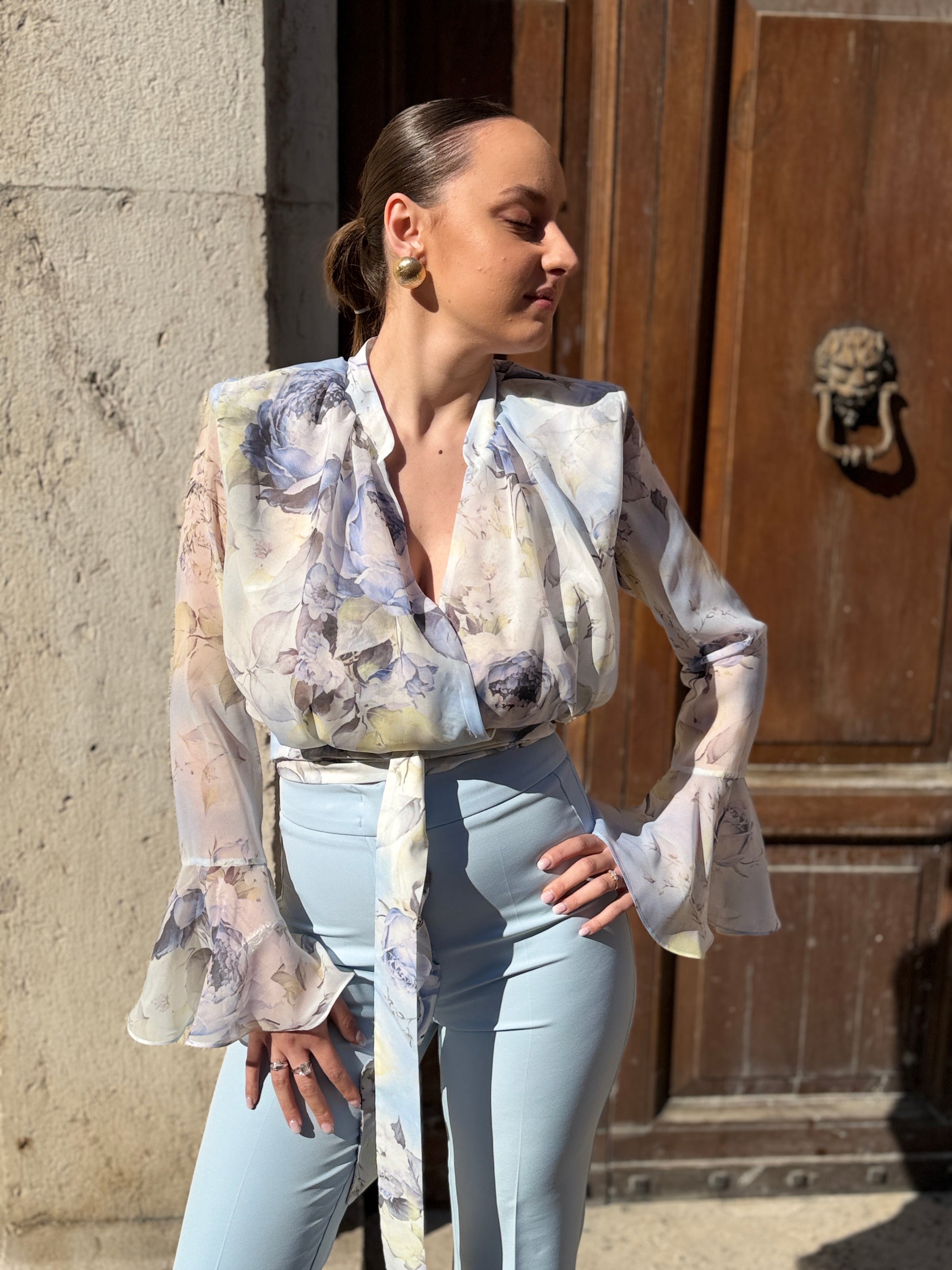 Blusa in chiffon ,modello Cropped con incrocio nel davanti, caratterizzato da una delicata fantasia floreale dai toni soft e luminosi, scollo a v, manica lunga con fondo svasato, spalline imbottite.