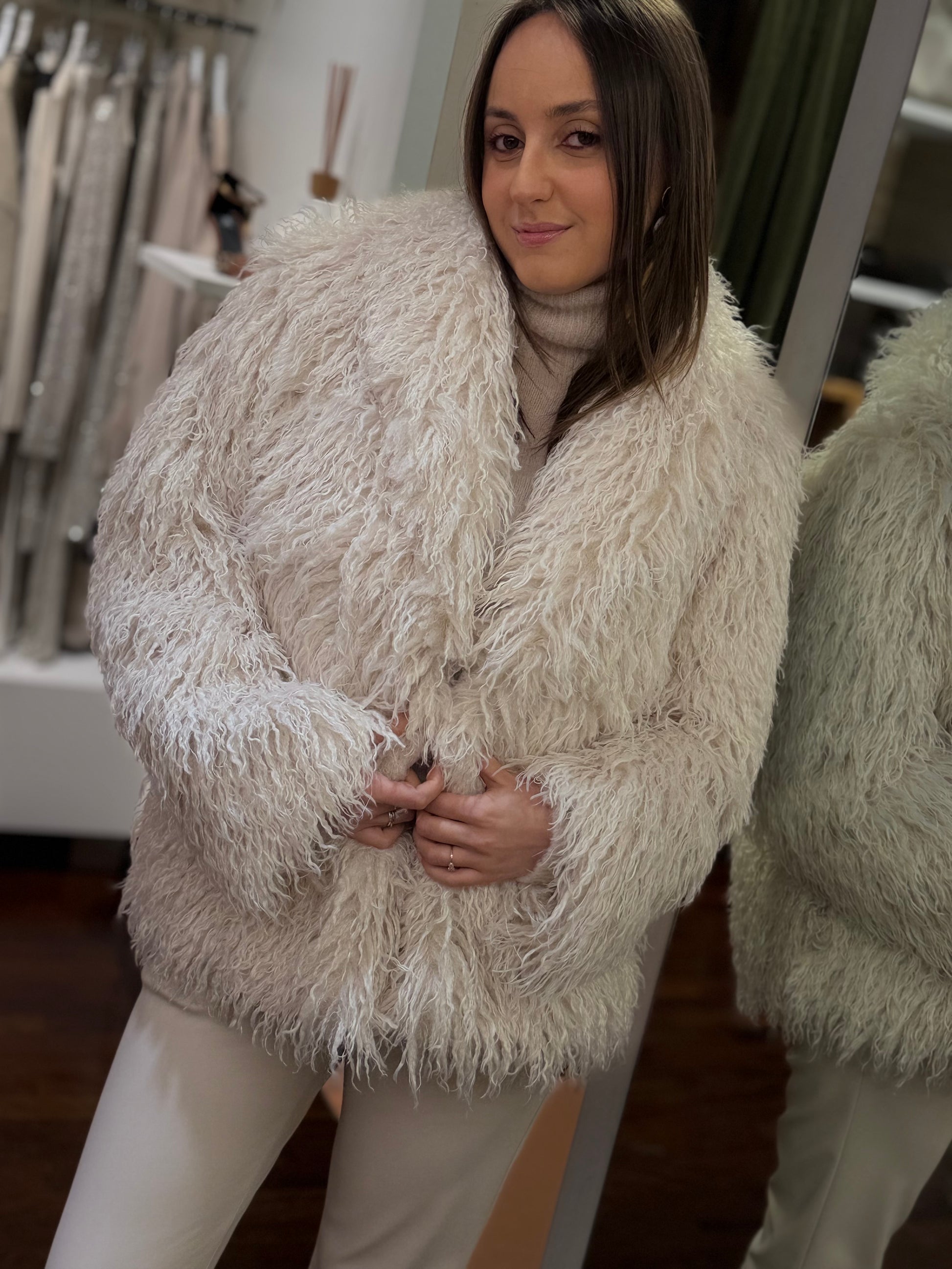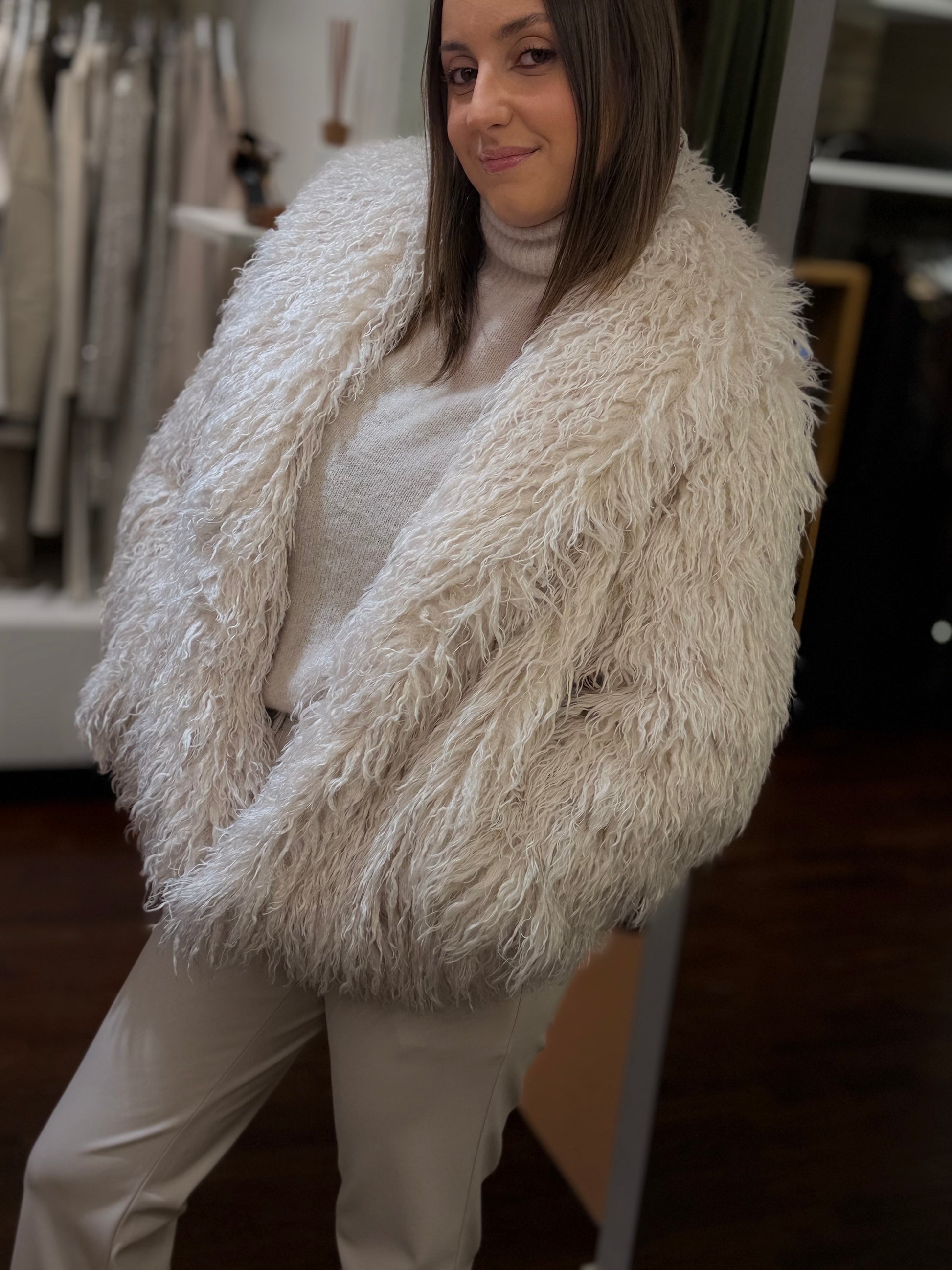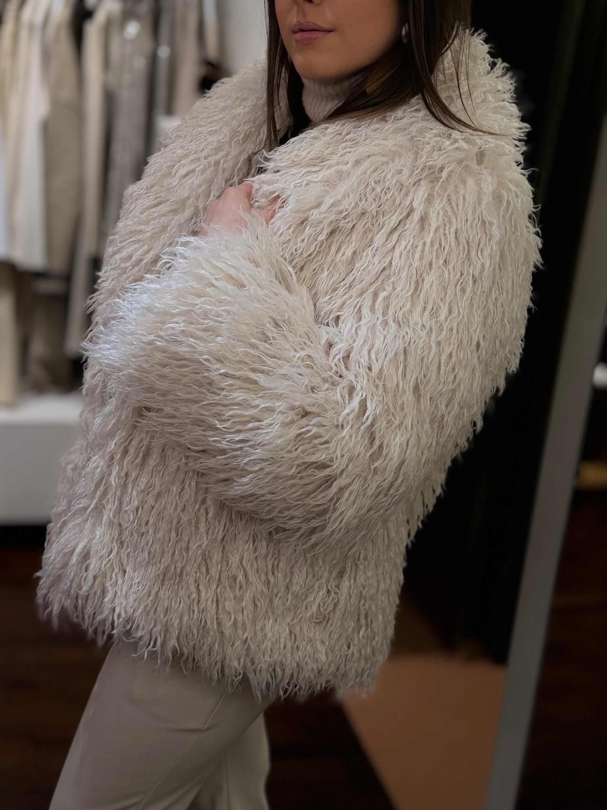 Eco-mongolia con tasche a filo e chiusura frontale con gancetto, foderata internamente. Morbida e leggera, offre un look sofisticato e moderno, perfetta per completare outfit casual ed eleganti.