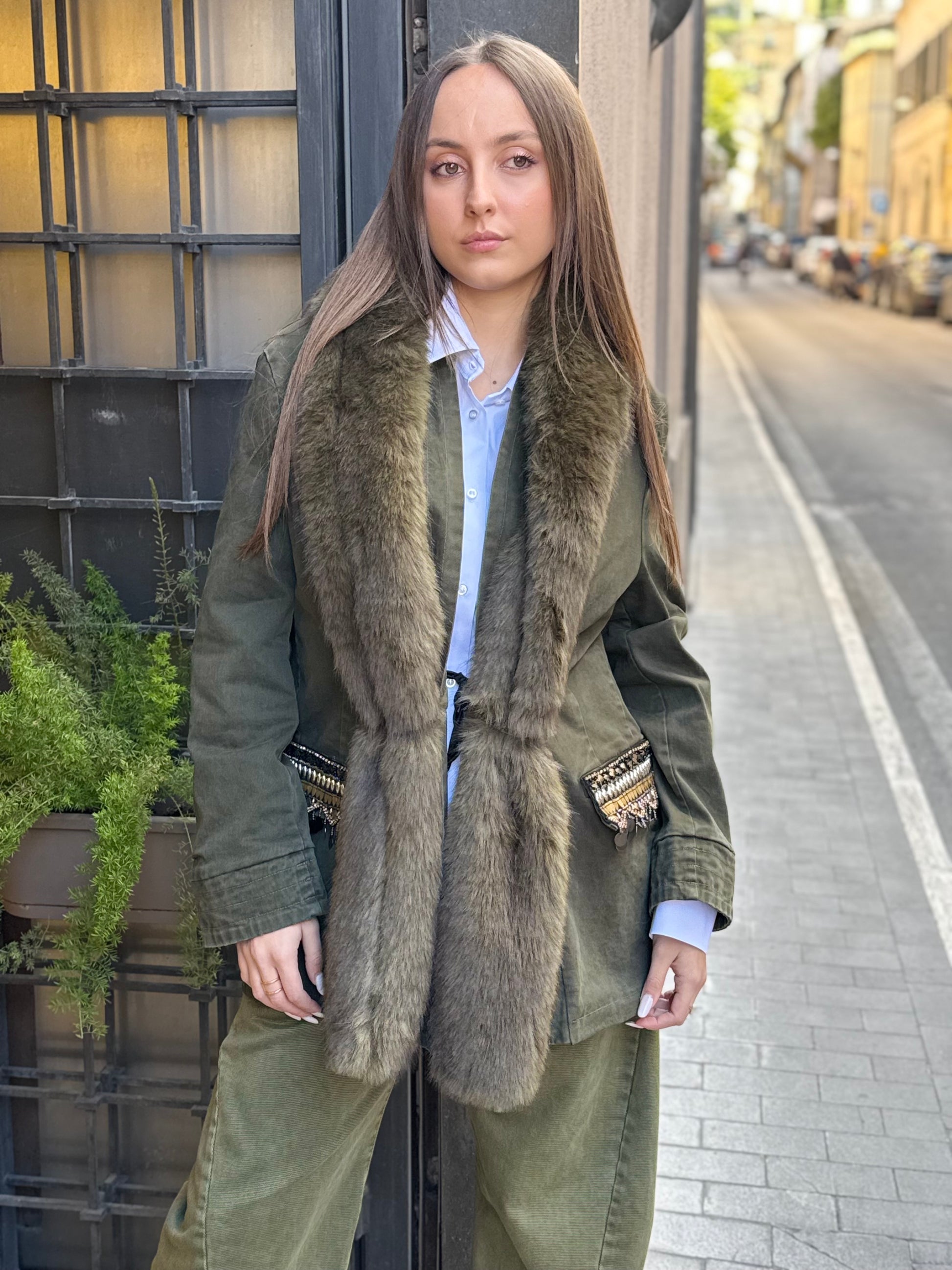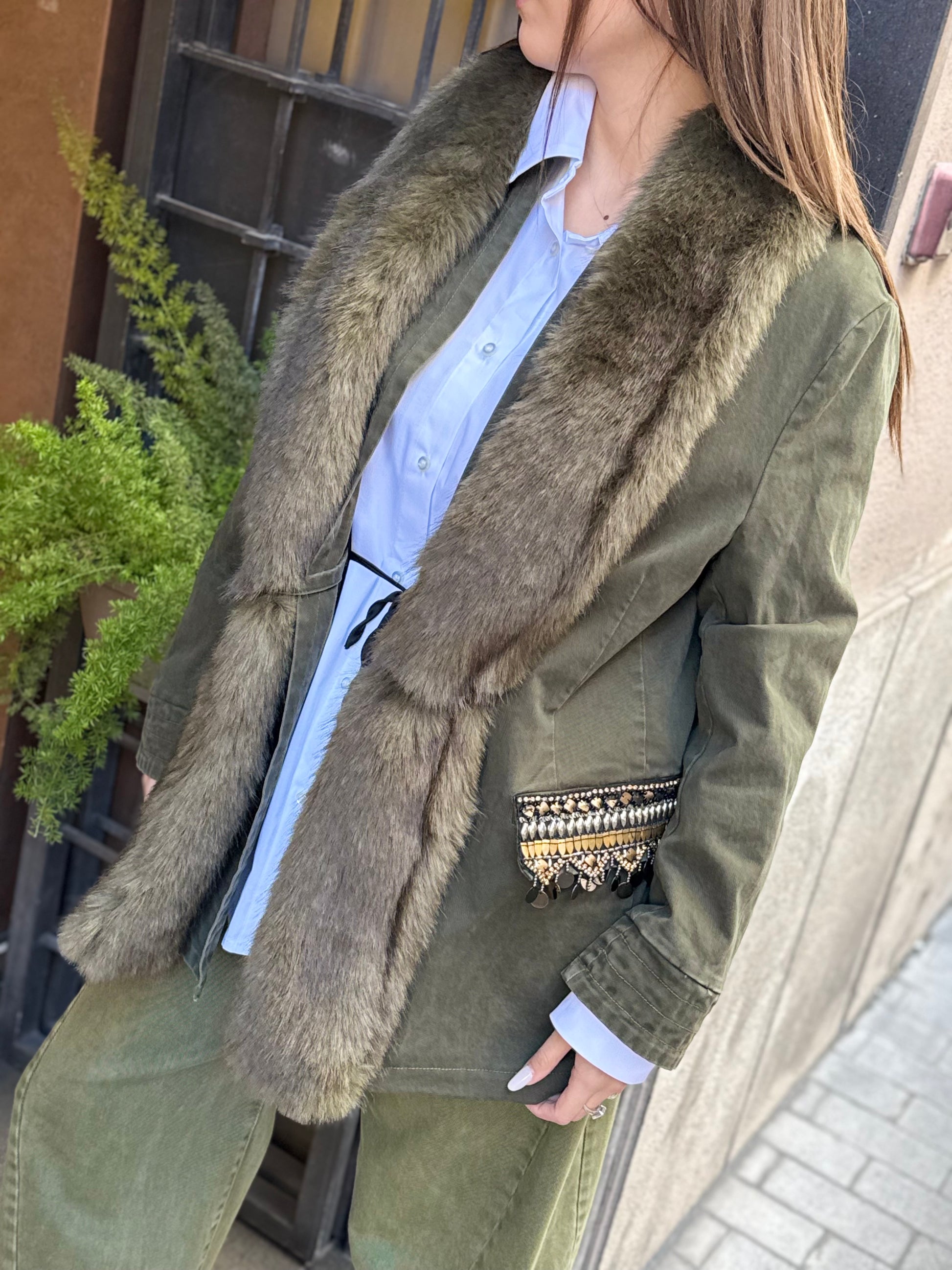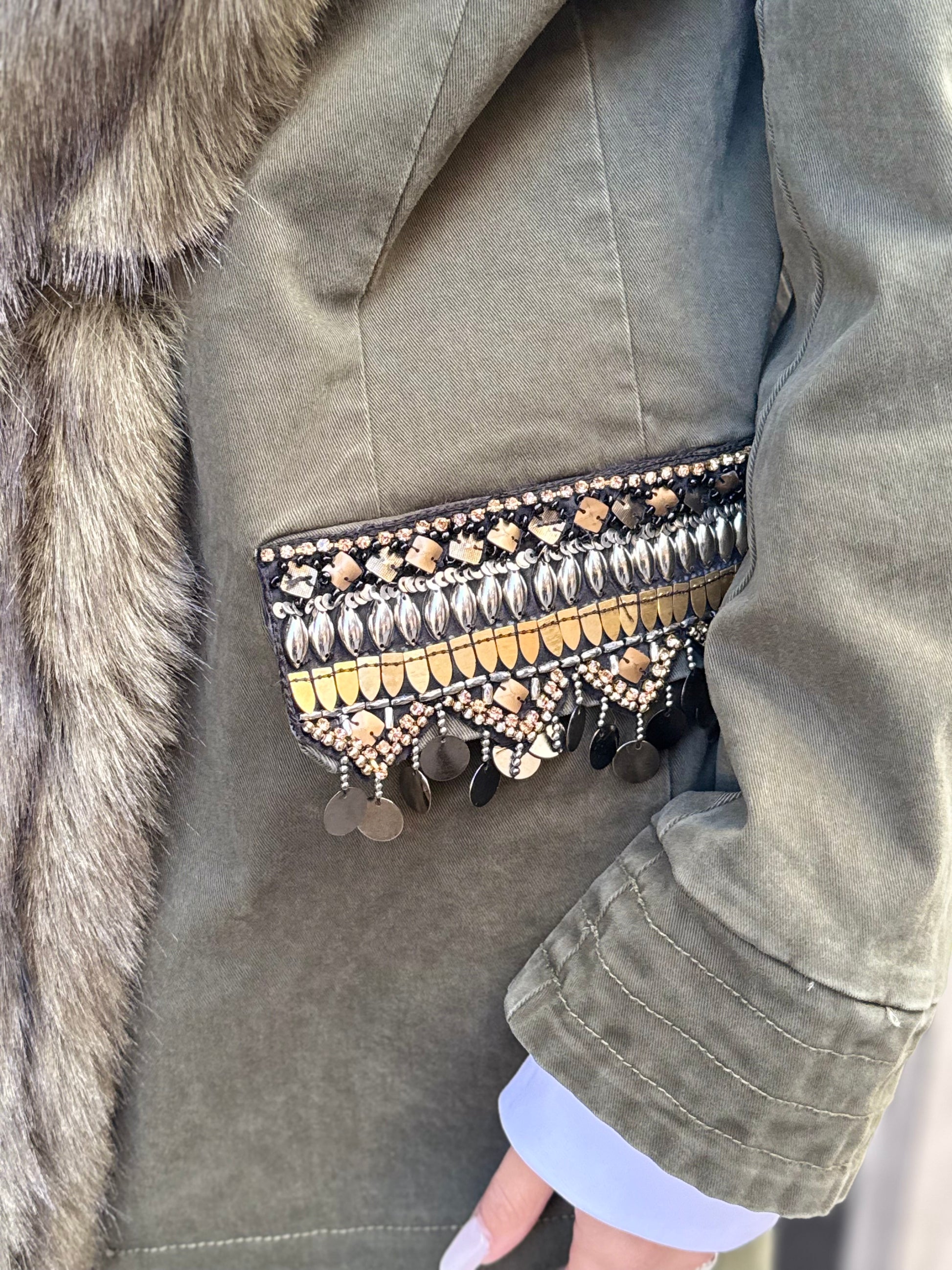 Giacca taglio over trapuntato internamente, con collo in ecopelliccia staccabile, doppia tasca laterale con inserti decorati con perline, strass e dischi metallici.