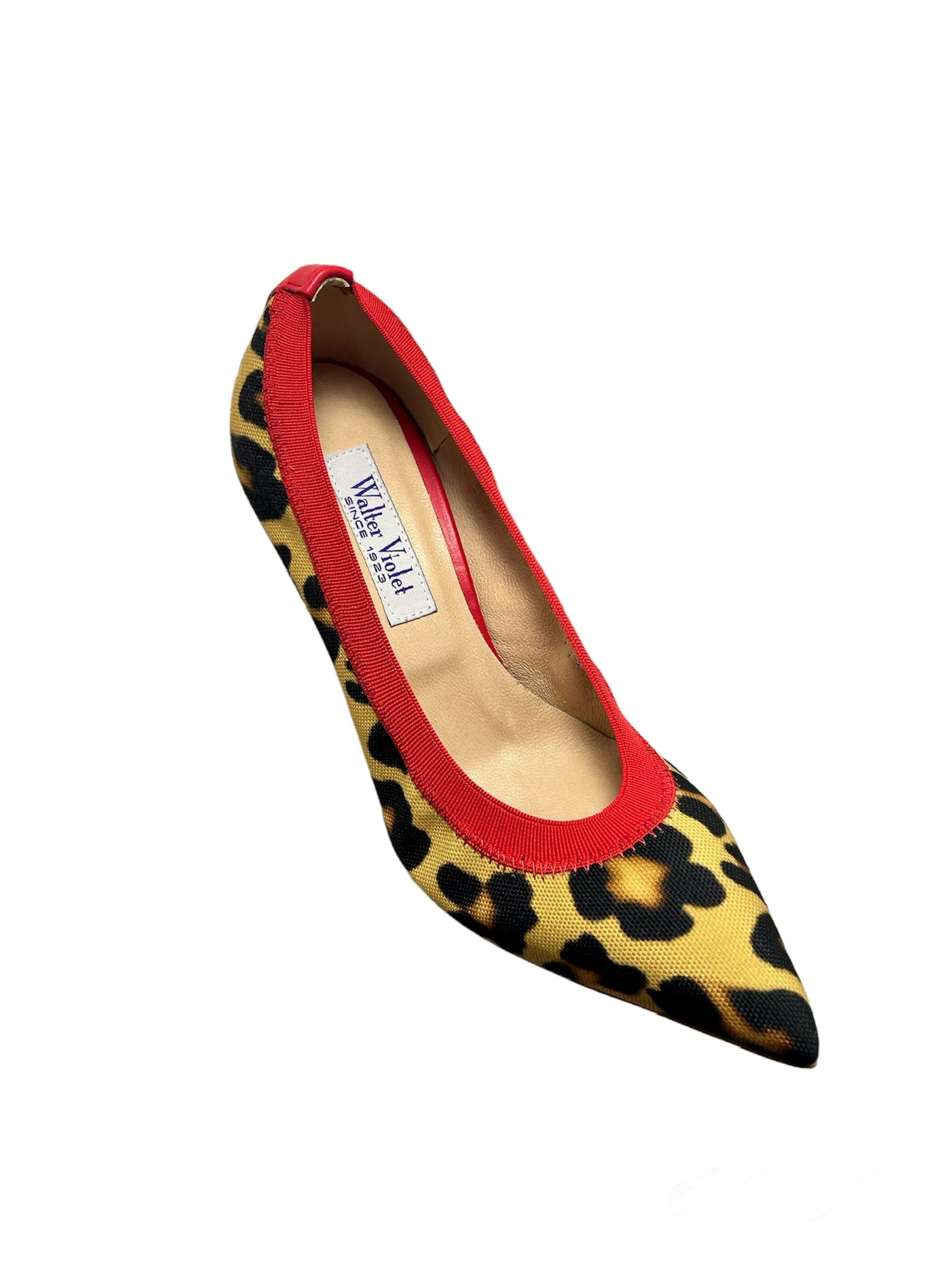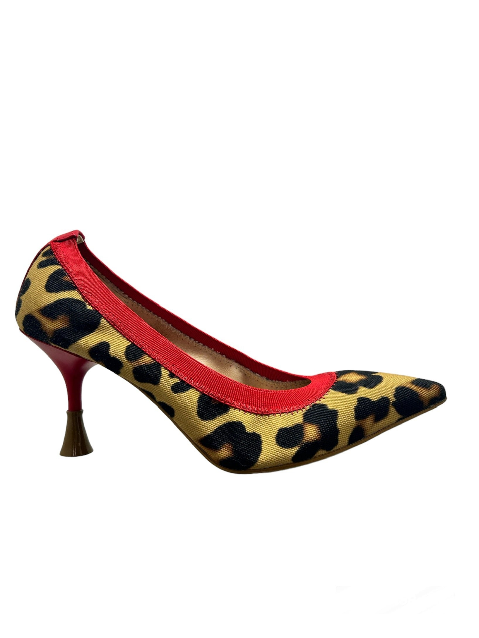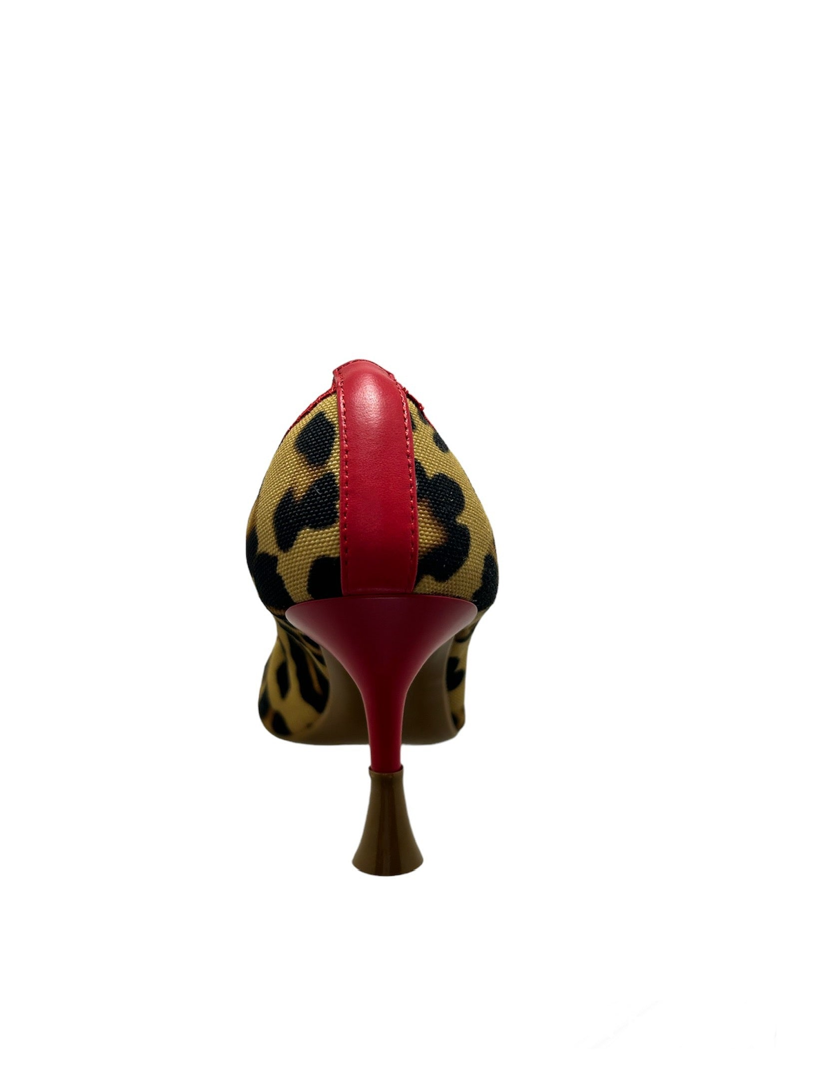 Decolletè tessuto maculato,nappa rossa, elastico rosso e tacco a clessidra 80mm